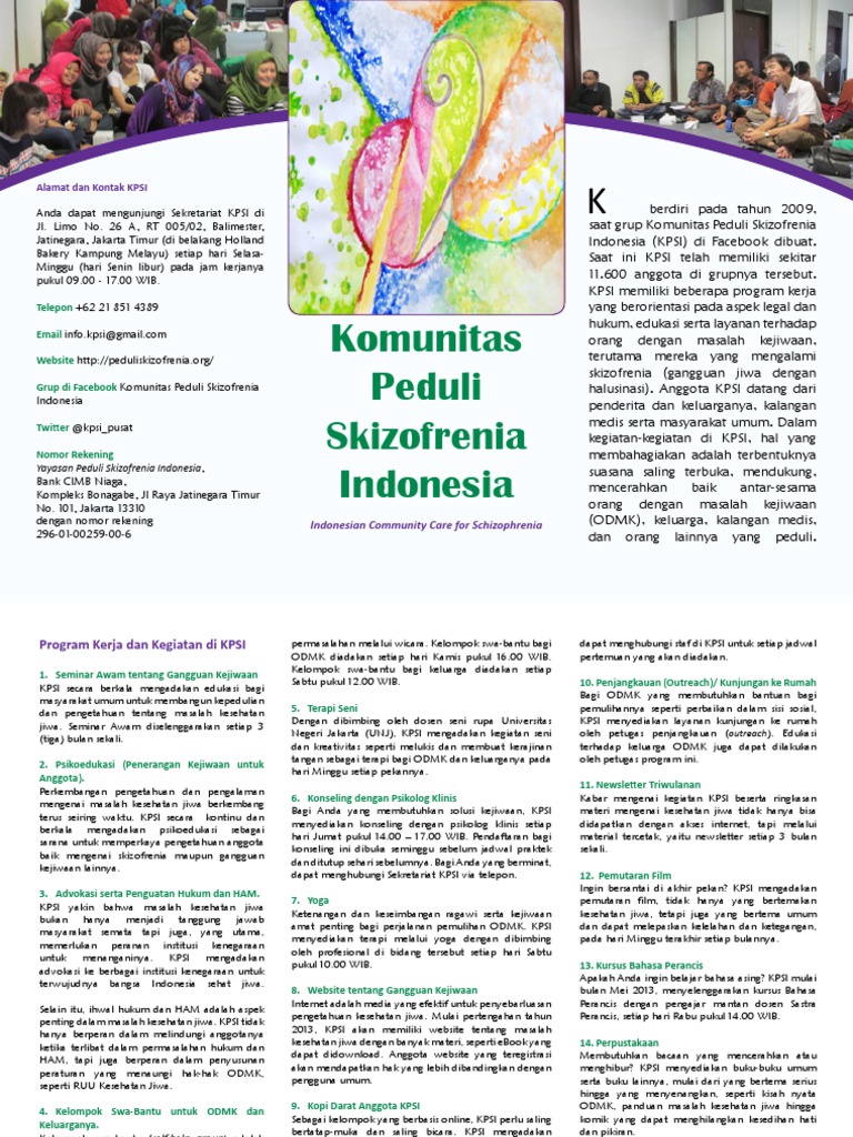Komunitas Peduli Skizofrenia Indonesia - Free download as Word Doc (.doc /.docx), PDF File (.pdf) or read online for free. Melalui para penderita yang tergabung dalam KPSI, bisa didapat informasi penanganan yang. Awalnya pemuda ini tak tahu, ilusi yang kerap dialaminya merupakan Walaupun saya tidak kenal orang itu," kata Lilik yang aktif di Komunitas Peduli Skizofrenia Indonesia (KPSI) ini.