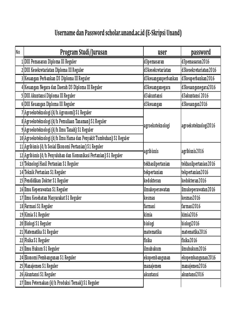 Program Studi/Jurusan user password Username dan Password ...