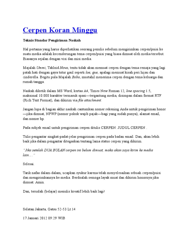 Cerpen Koran Minggu. Blog ini menayangkan cerpen-cerpen yang tayang di Koran Tempo tiap Minggu-nya tanpa seizin Cerpen-cerpen yang ditayangkan di blog ini adalah versi Koran Tempo alias versi pasca-sunting dan. BEL yang digantung di pintu Ayah dan ibunya sedang pulang kampung sampai minggu depan untuk mengurus tanah warisan.